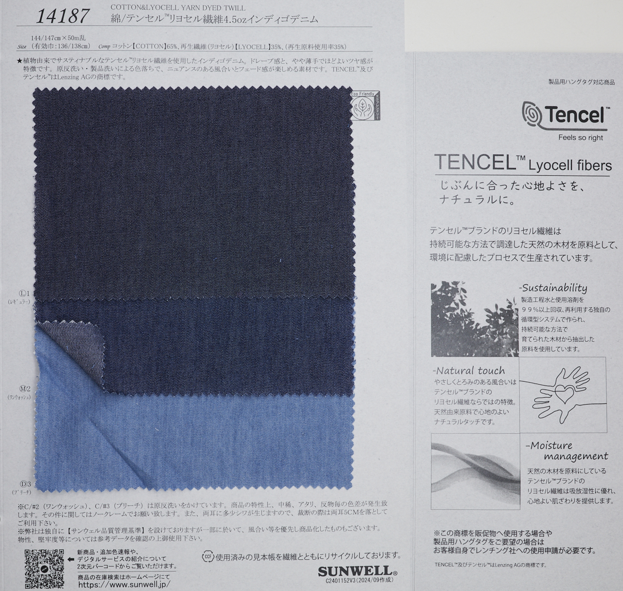 식물성 원료로 지속 가능한 텐셀™ 라이오셀 섬유로 만든 인디고 데님. 드레이프가 있으며, 살짝 얇은 질감과 적당한 광택이 특징입니다. 세탁 및 마감 시 색상이 바래며, 미묘한 질감과 바랜 외관을 줍니다. TENCEL™ 및 텐셀™은 렌징 AG의 상표입니다.