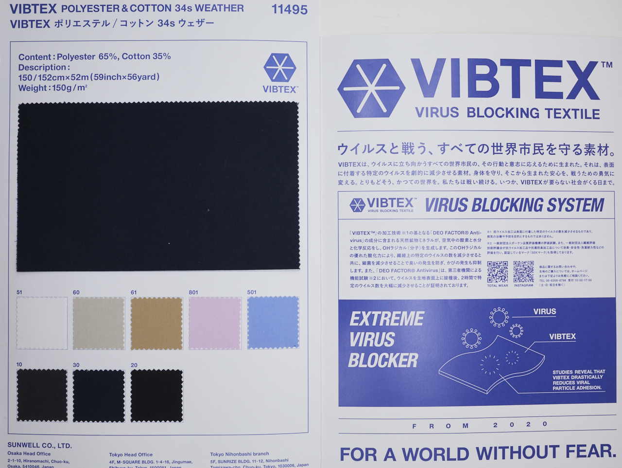 우리의 뉴노멀에 걸맞은 항바이러스 가공 "VIBTEX®(비브텍스)". 이 가공을 통해 표면에 부착된 특정 바이러스를 감소시키는 기능을 가진 중간 두께의 폴리에스터/코튼 웨더 소재입니다. 적당한 탄력감이 있으며, 청결한 느낌을 주는 깔끔한 외관이 특징입니다. 폴리에스터의 내구성과 코튼의 자연스러움을 동시에 갖춘, 안전하고 위생적인 클린 텍스타일입니다.