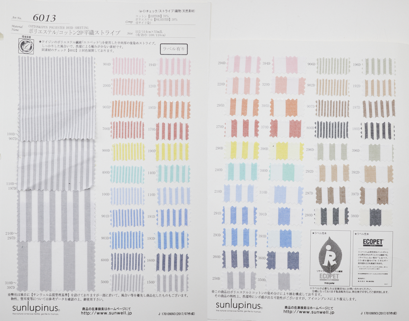 페트병이나 섬유 부산물 등을 원료로 한 리사이클 폴리에스터 "ECOPET®"을 사용한 지속 가능한 시칭 스트라이프. 건조하고 탄탄한 질감을 가지며, 거친 캐주얼한 외관이 특징입니다. 세탁에 의한 수축이 적은 중간 두께 소재입니다. 동일 소재의 체크【6012】과 같은 색상으로 전개됩니다. ※"ECOPET®(에코펫®)"은 Teijin Frontier Co., Ltd.의 상표입니다.