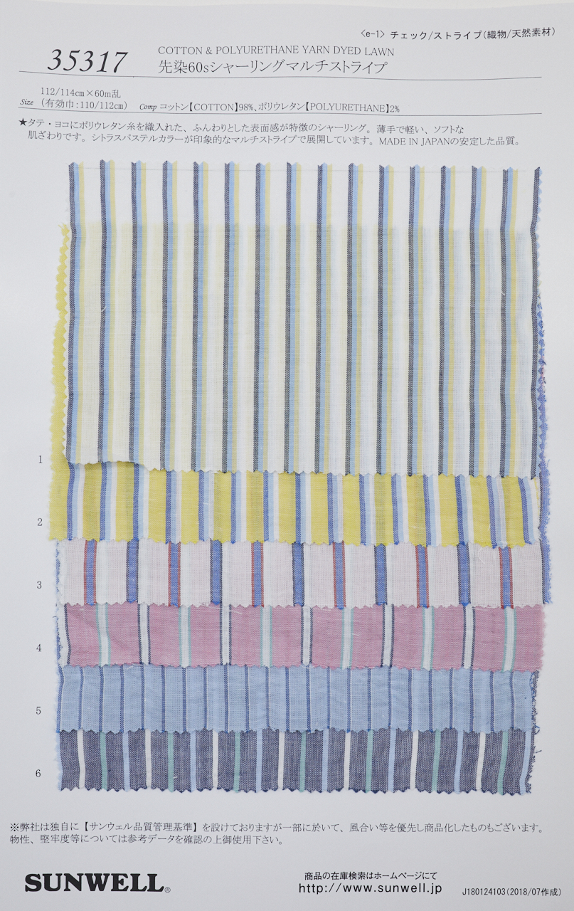 세로와 가로에 폴리우레탄 실을 섞어 짠 부드러운 표면감이 특징인 셔링. 얇고 가벼우며 부드러운 촉감을 가집니다. 시트러스 파스텔 컬러가 인상적인 멀티 스트라이프로 전개됩니다. 일본산의 안정된 품질입니다.