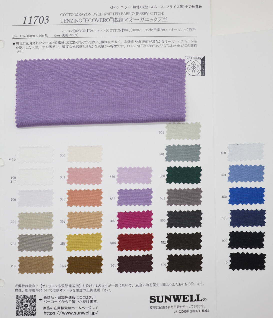 환경에 배려된 레이온 단섬유 LENZING™ ECOVERO™와 섬유 길이가 길고 실 강도 및 실 표면이 부드러운 오가닉 코튼 실을 사용한 천축. 약간 얇고 적당한 광택감과 부드러운 촉감이 특징입니다. LENZING™ 및 ECOVERO™는 Lenzing AG의 상표입니다.