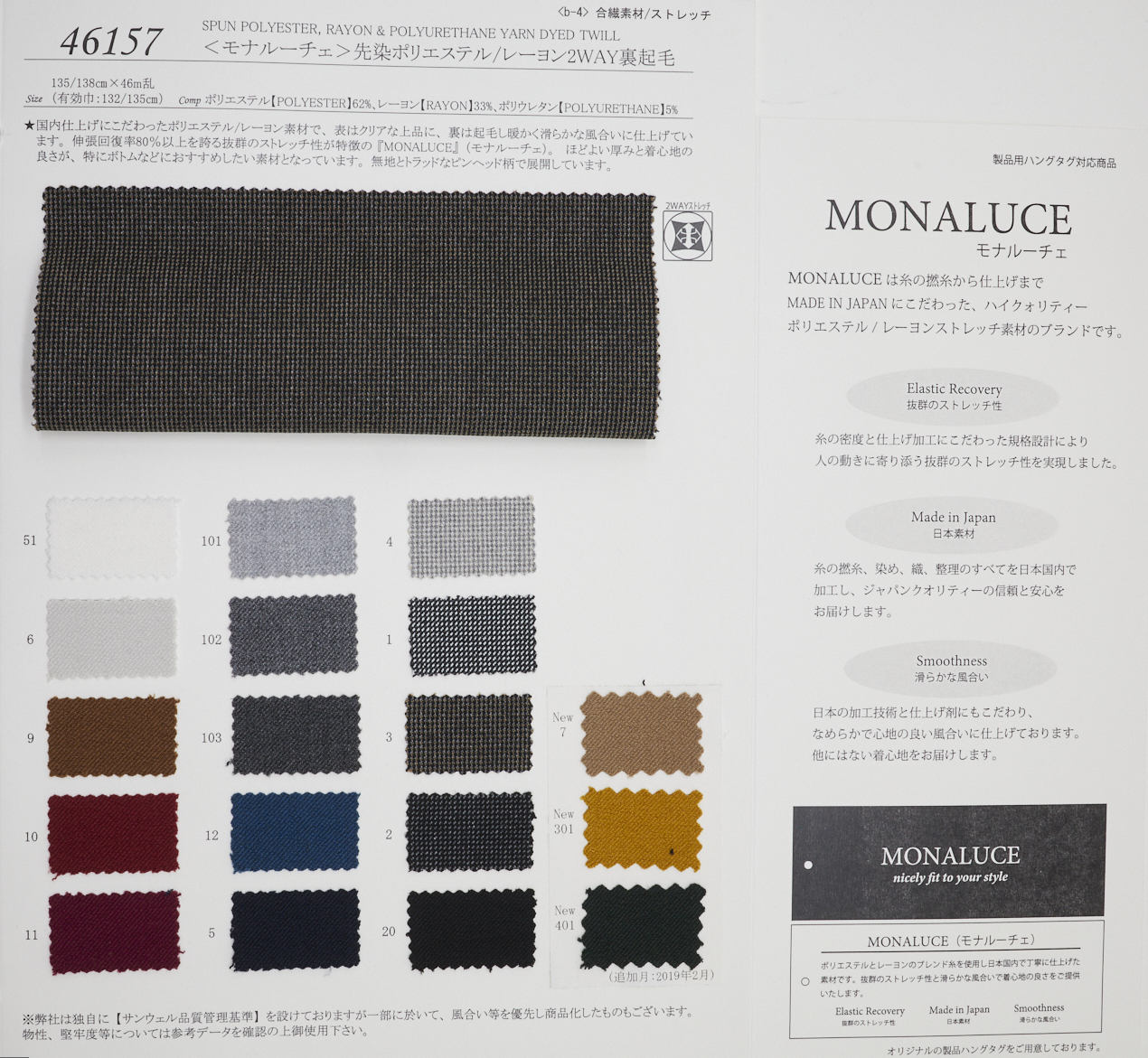 폴리에스터/레이온 소재로 제작되었으며, 국내 마무리에 중점을 두었습니다. 앞면은 깔끔하고 우아한 느낌을 주며, 뒷면은 기모 처리가 되어 따뜻하고 부드러운 질감을 제공합니다. "MONALUCE"는 80% 이상의 스트레치 회복률을 자랑하는 뛰어난 신축성을 특징으로 합니다. 적당한 두께와 편안함 덕분에 특히 하의에 추천되는 소재입니다. 단색과 전통적인 핀헤드 패턴으로 제공됩니다.