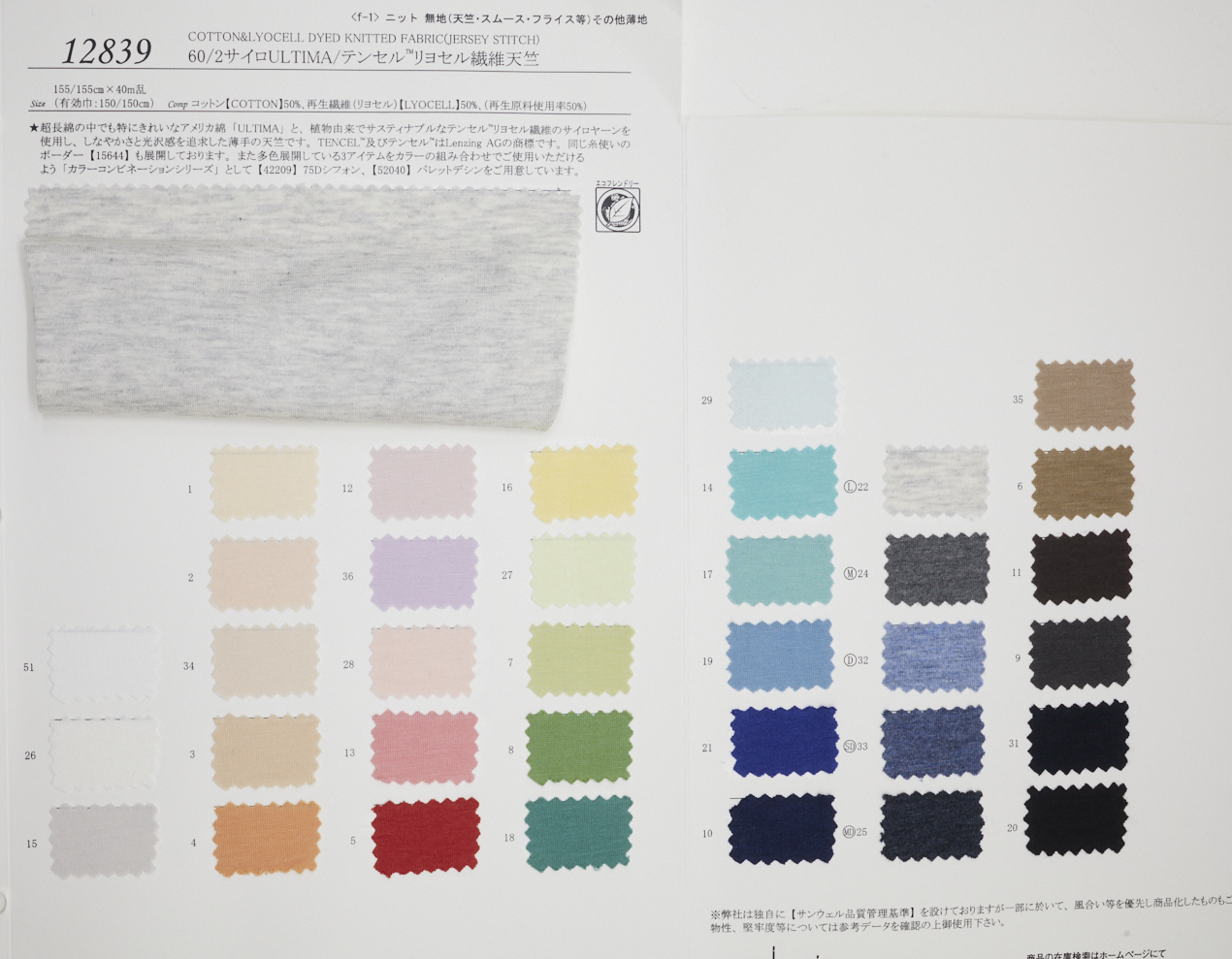 최상급 미국 면 'ULTIMA'와 식물 유래의 지속 가능한 텐셀™ 리오셀 섬유의 사일로얀을 사용하여 유연성과 광택을 추구한 얇은 천축입니다. TENCEL™ 및 텐셀™은 Lenzing AG의 상표입니다. 동일 실로 보더【15644】도 전개하고 있습니다. 또한 다양한 색상으로 제공되는 3개 아이템을 색상 조합으로 사용할 수 있도록 '컬러 콤비네이션 시리즈'로【42209】 75D 쉬폰, 【52040】 팔레트 데신을 준비했습니다.
