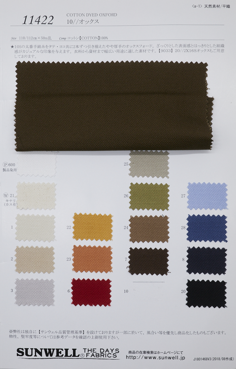 10S의 굵은 면사를 세로와 가로 모두 2가닥씩 사용한 약간 두꺼운 옥스포드입니다. 거친 표면감과 뚜렷한 조직감이 캐주얼한 인상을 줍니다. 의류부터 자재까지 다양한 용도에 적합한 소재입니다. 【9033】 20//2 X 16S 옥스포드도 준비되어 있습니다.