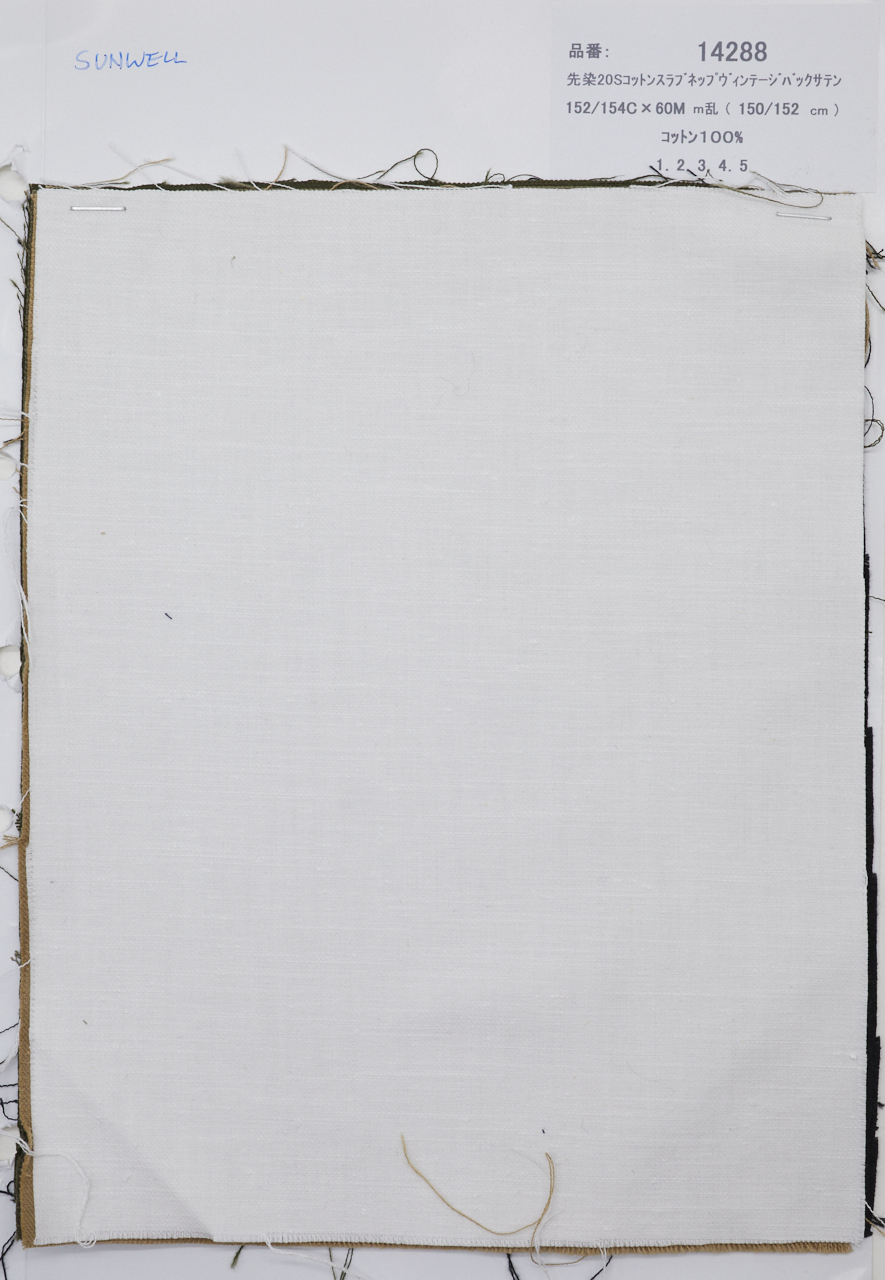 20s 코튼을 사용한 중간 두께의 백 새틴. 매트한 외관으로 탄력과 부드러움을 함께 지닌 질감입니다. 슬러브 실과 네프에 의한 자연스러운 표면감과 천연 소재의 산뜻한 촉감이 특징입니다.